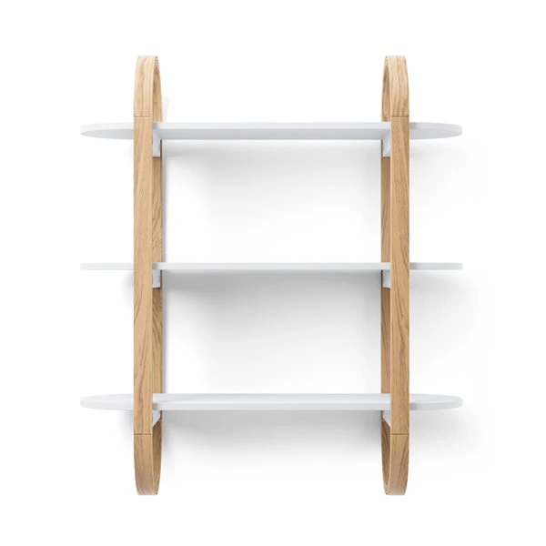 - This modern wall shelf features three pill-shaped shelves with curved bentwood accents