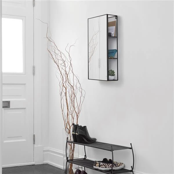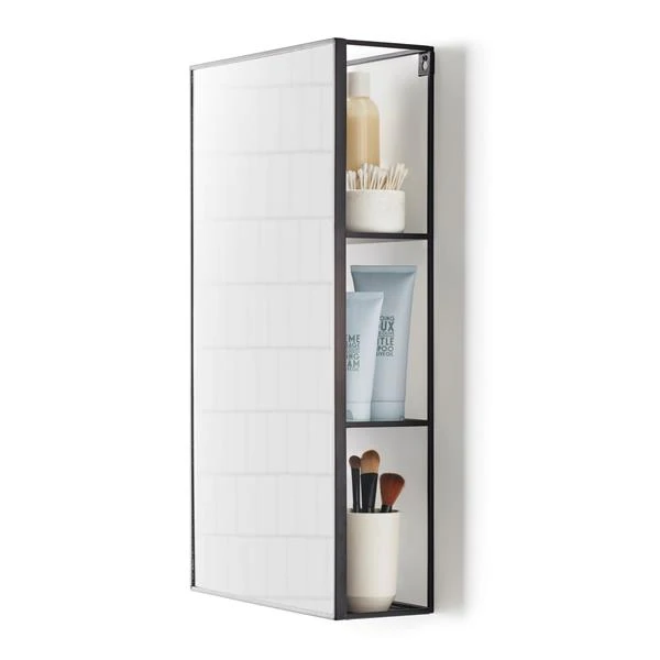 - A modern medicine cabinet with open shelving hidden in behind the mirror; use in the bathroom as a medicine cabinet or in the entryway for storing daily essentials