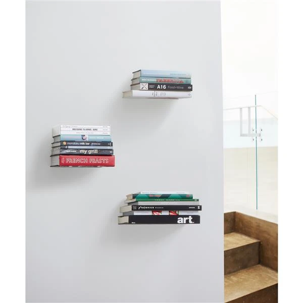 - UNIQUE, INNOVATIVE DESIGN: Transform the way you store and display your favorite books by stacking them on a sturdy metal L-shaped shelf that becomes hidden by the books, allowing them to appear as though they are floating on your wall