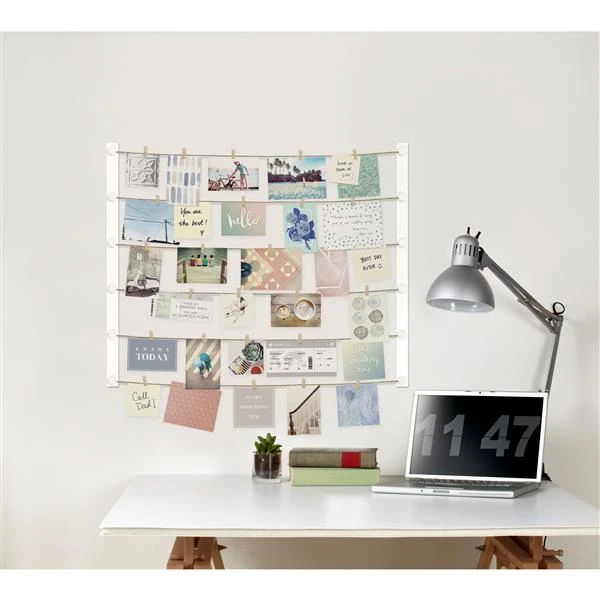 - TURN YOUR MEMORIES INTO ART: With this dynamic memo board you can display small memorabilia, memos, 4×4, 4×6 and 5×7 photos, as well as greeting cards, Instax and Polaroid photos along its twine cords using the included clothespins